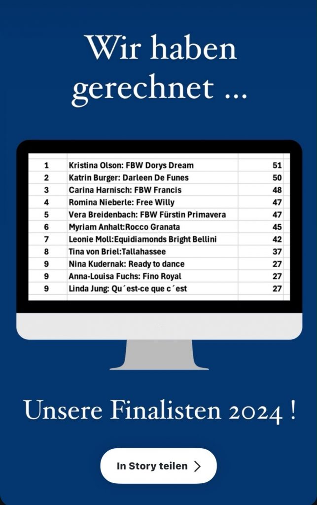 Im Finale bei den German Masters in Stuttgart sind die besten zehn Paare aus den insgesamt vier Qualifikationsprüfungen startberechtigt und unsere Nina gehört dazu – wir sind superstolz auf die Beiden und werden selbstverständlich mitfiebern und alle Daumen drücken!