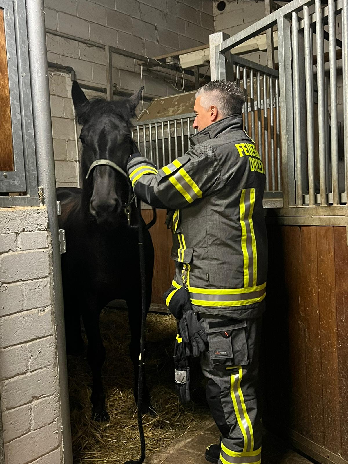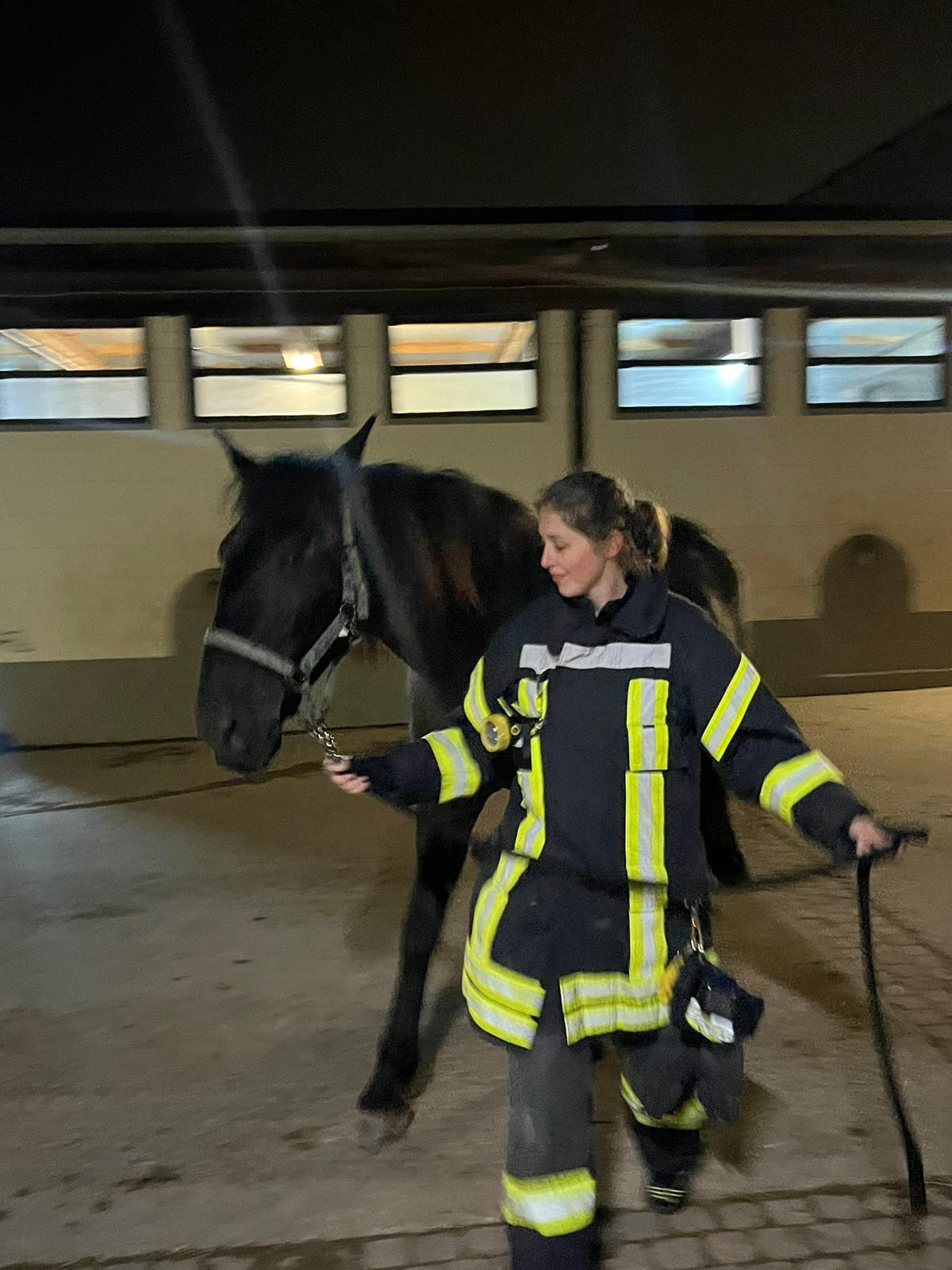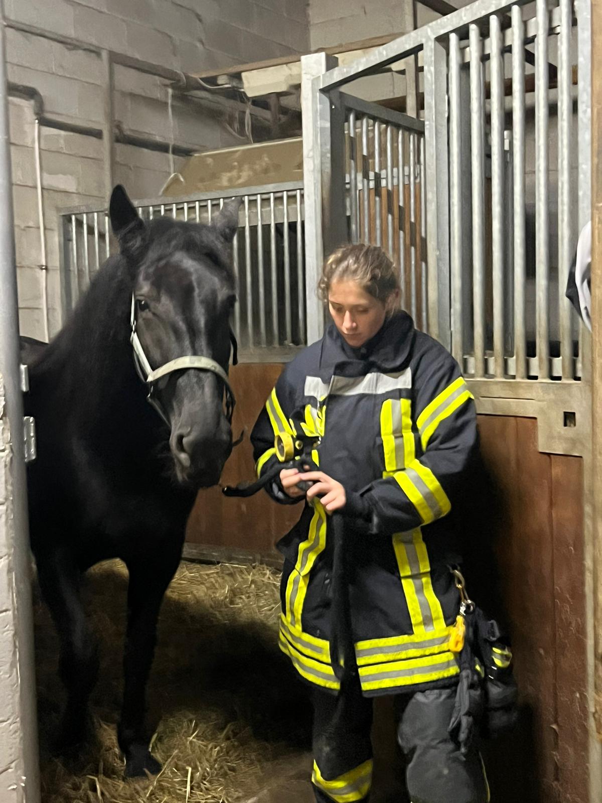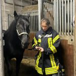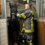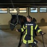 Jetzt geht es an die Hauptperson dieses Spezial-Einsatze: das Pferd – in unserem Fall: die Pferde. Eines der dienstältesten Einstellerpferde, Janosch, wird als erstes von den Feuerwehrleuten unter fachkundiger Anleitung aufgehalfert und aus der Box geführt. Der 24-jährige Wallach macht das wie ein Profi. Er lässt sich von den Menschen in voller Feuerwehrmontur mit Blendstreifen usw. ganz entspannt anfassen und auch aus der Box führen. Dann kommt eines der jüngsten Pferde aus der Box. Auch sie, die 5-jährige Stute Olive, findet das ganze Aufsehen um sie eher spannend als angsteinflößend.