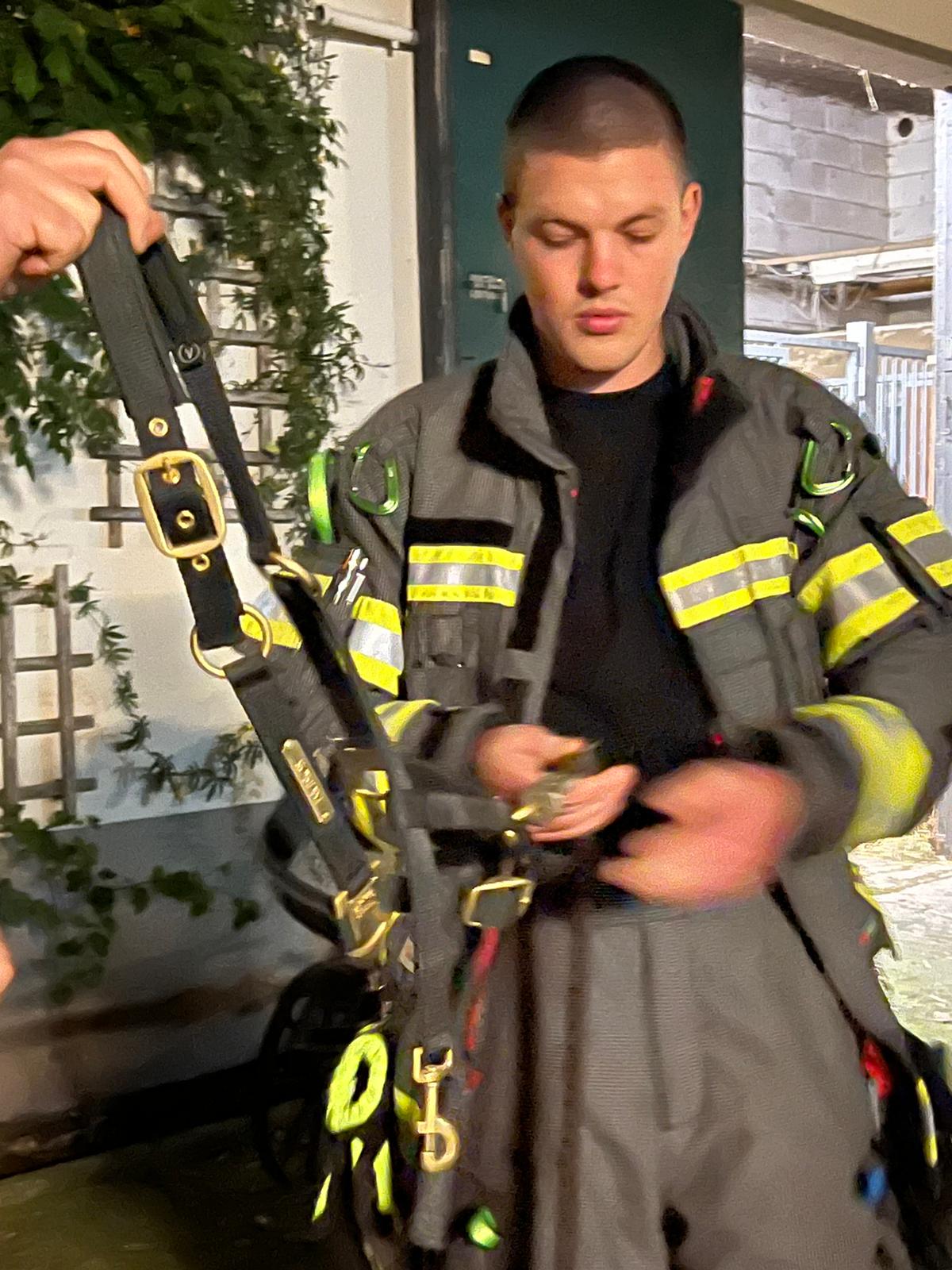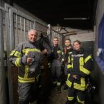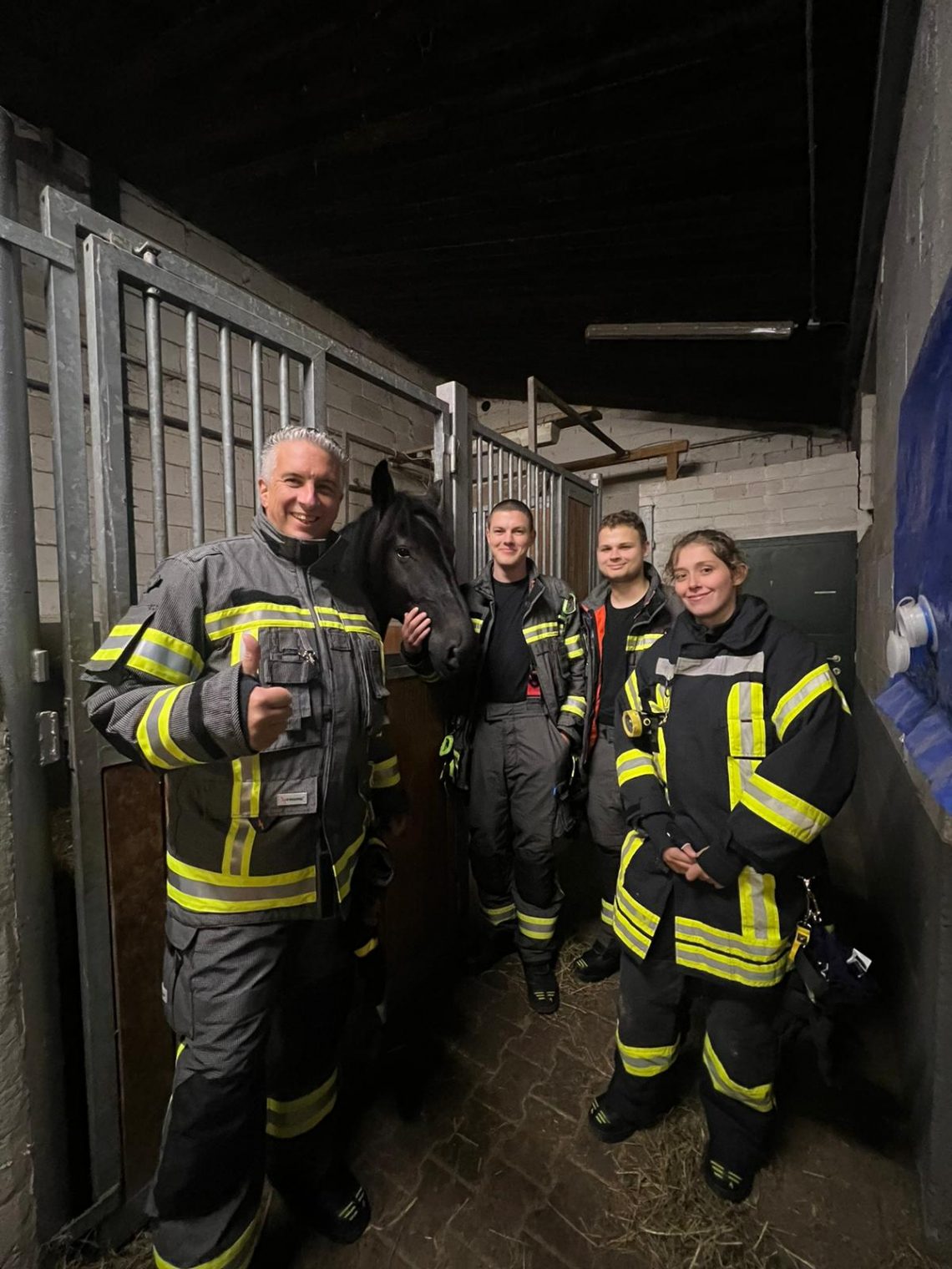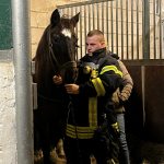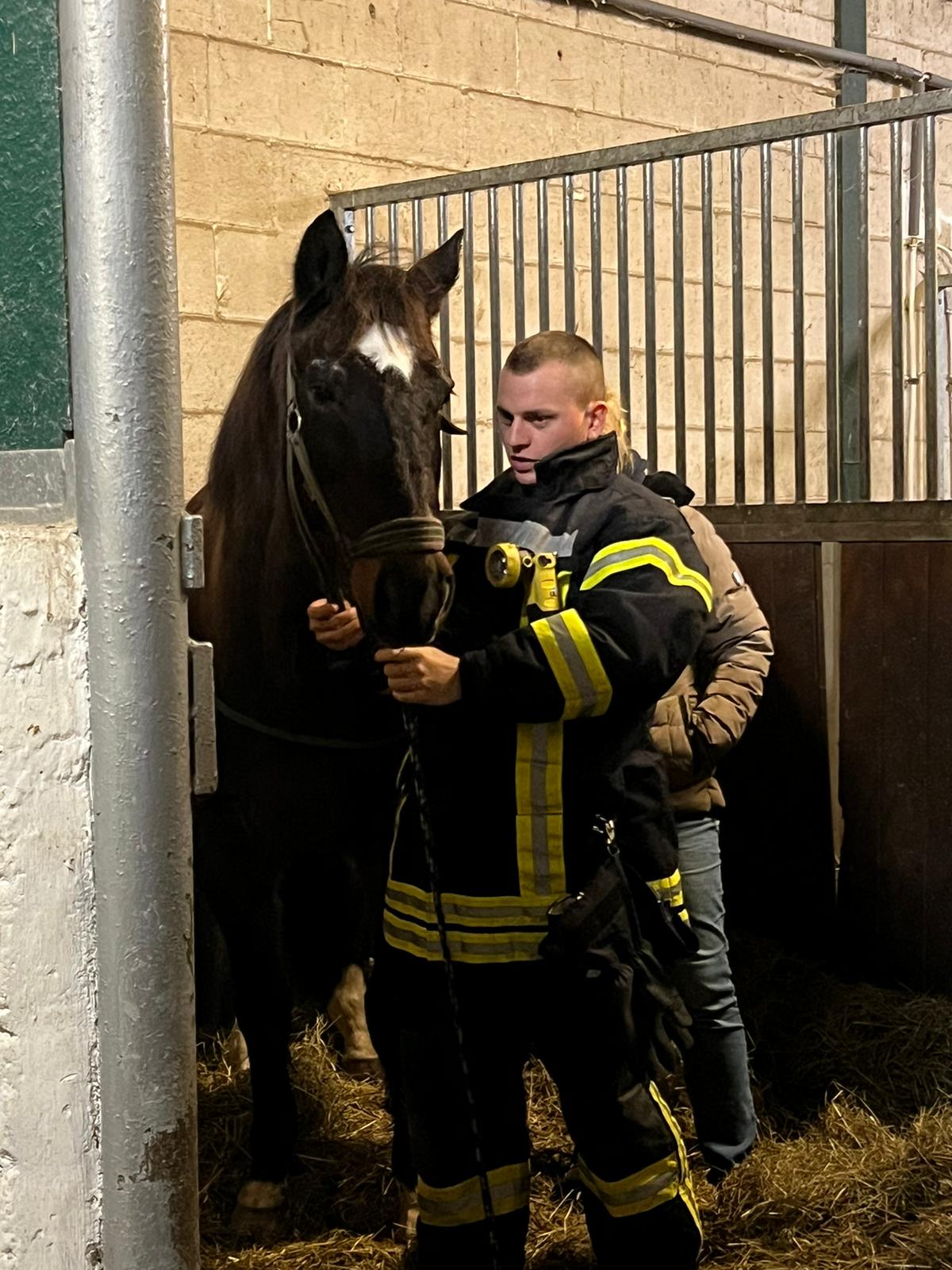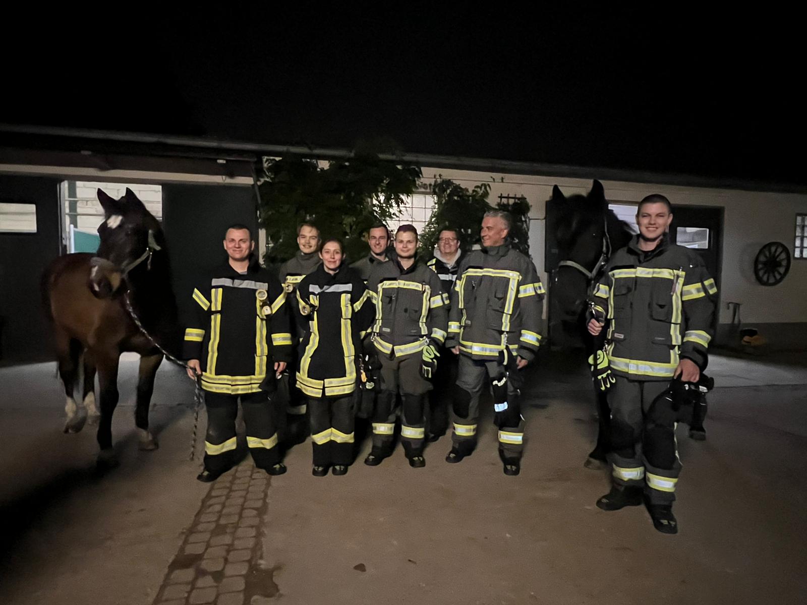 Jetzt geht es an die Hauptperson dieses Spezial-Einsatze: das Pferd – in unserem Fall: die Pferde. Eines der dienstältesten Einstellerpferde, Janosch, wird als erstes von den Feuerwehrleuten unter fachkundiger Anleitung aufgehalfert und aus der Box geführt. Der 24-jährige Wallach macht das wie ein Profi. Er lässt sich von den Menschen in voller Feuerwehrmontur mit Blendstreifen usw. ganz entspannt anfassen und auch aus der Box führen. Dann kommt eines der jüngsten Pferde aus der Box. Auch sie, die 5-jährige Stute Olive, findet das ganze Aufsehen um sie eher spannend als angsteinflößend.