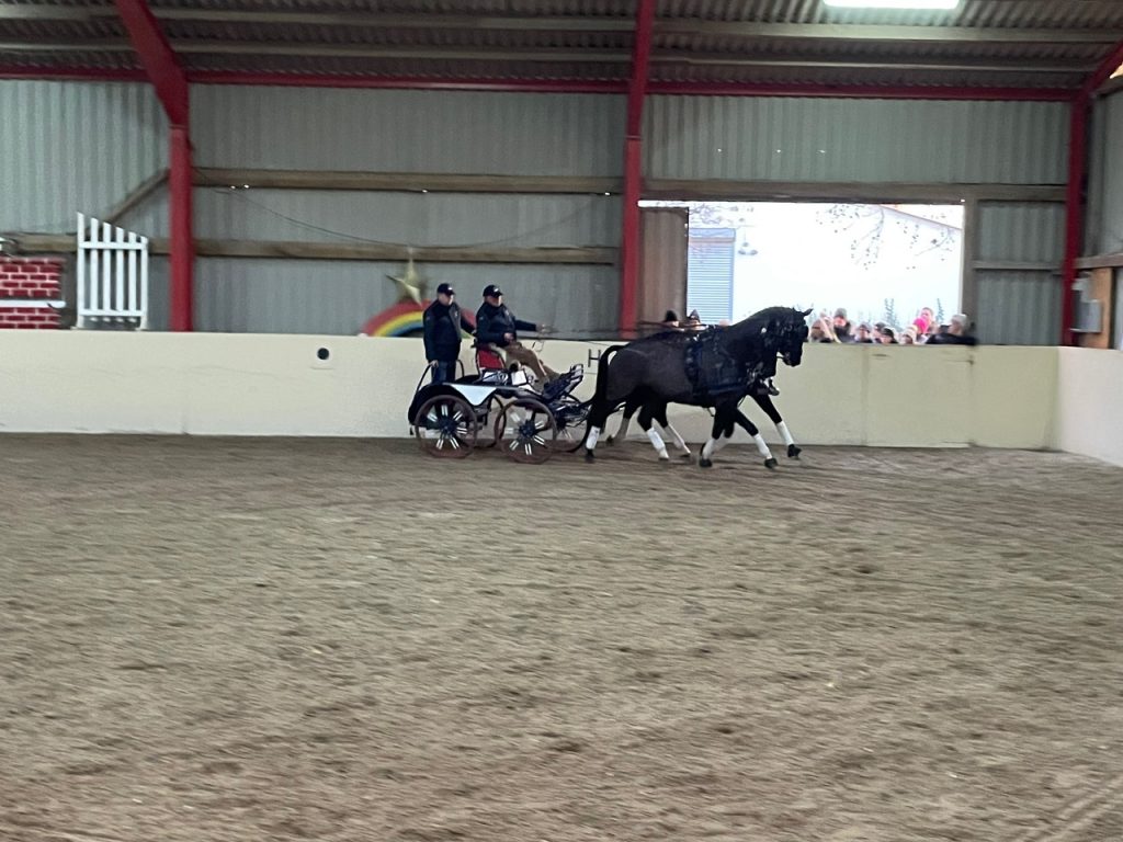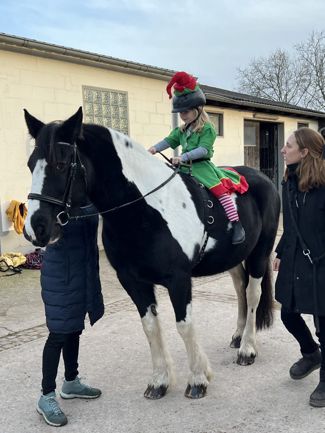Im Anschluss entführte Ulrike Keller die Zuschauer mit der zauberhaften Weihnachtsgeschichte „Die verschwundene Christbaumkugel“ in eine Welt voller Magie und Vorfreude. Die Geschichte nahm ihren Lauf, als Pferd Dooley, begleitet von der Weihnachtselfe Olive, die Reithalle betrat. Die kleine silberne Christbaumkugel erlebte mit dem verspielten Elf Sparky aufregende Abenteuer.